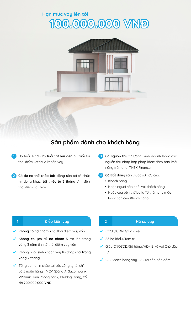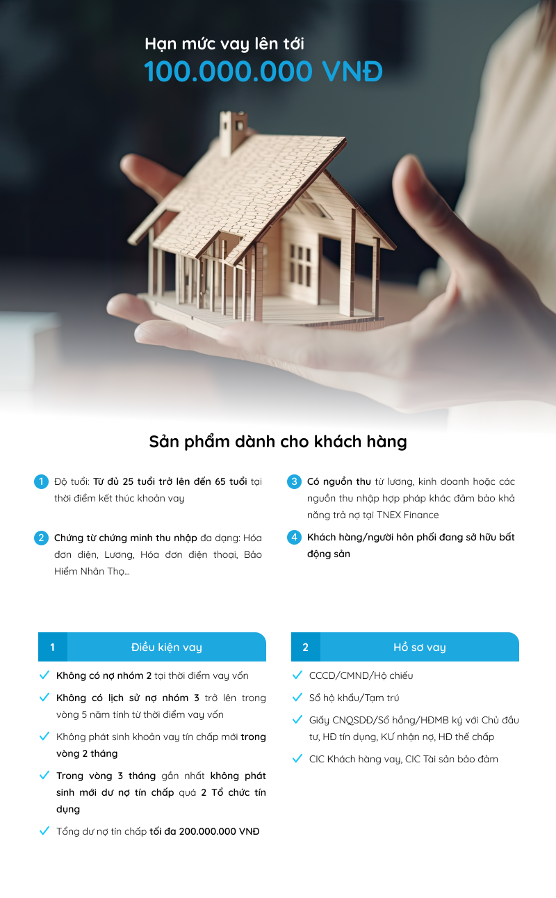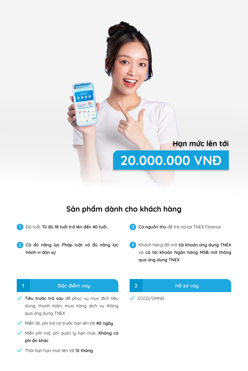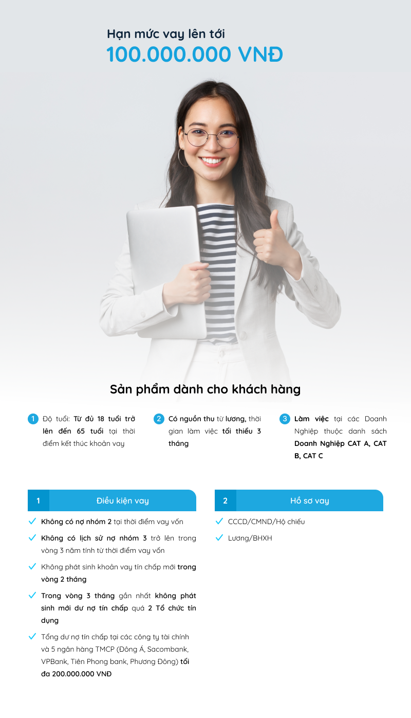 “Cho vay đến 100 triệu, không cần tài sản thế chấp, trả góp hàng tháng, thời hạn vay từ 3 tháng - 36 tháng, thủ tục đơn giản, đáp ứng mọi nhu cầu tiêu dùng của bạn”